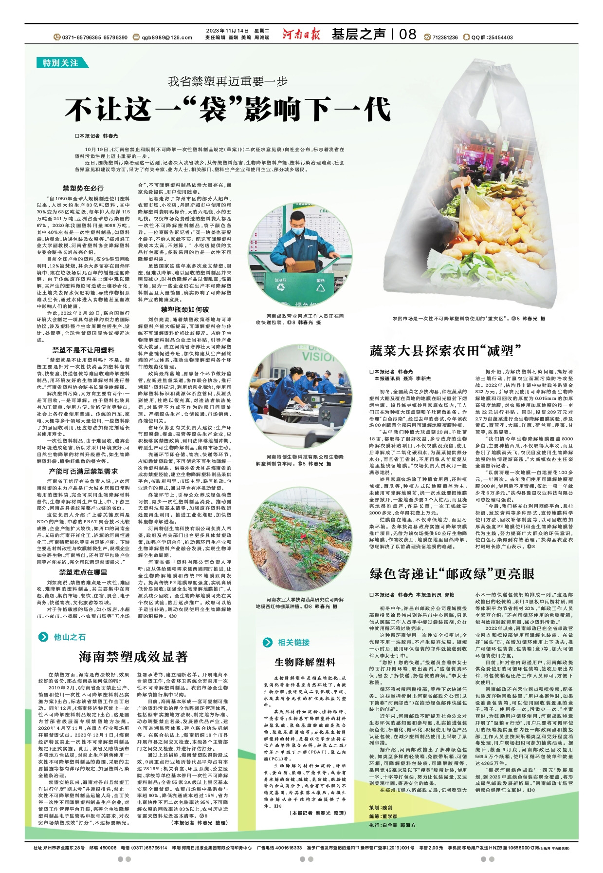一次性可降解塑料袋、地膜、快遞外包裝、可降解餐盒……如今,該企業利用玉米、甘蔗渣、咖啡渣等農作物制成的可降解塑料制品,暢銷30多個國家和地區。在國內,中國郵政、京東、順豐、丹尼斯、大潤發、美團、唯品會等該企業重要合作伙伴使用的塑料袋都是浚縣制造